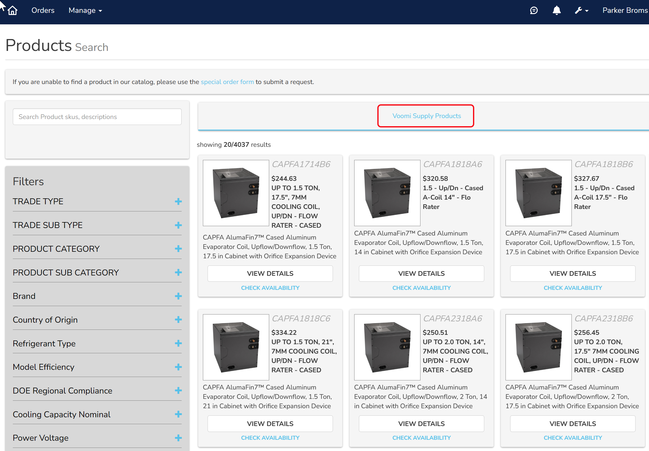 You can also create a new work order or open an existing one, add equipment, and check the product's availability. - You can only filter and search products that are available to that Direct Supply client.